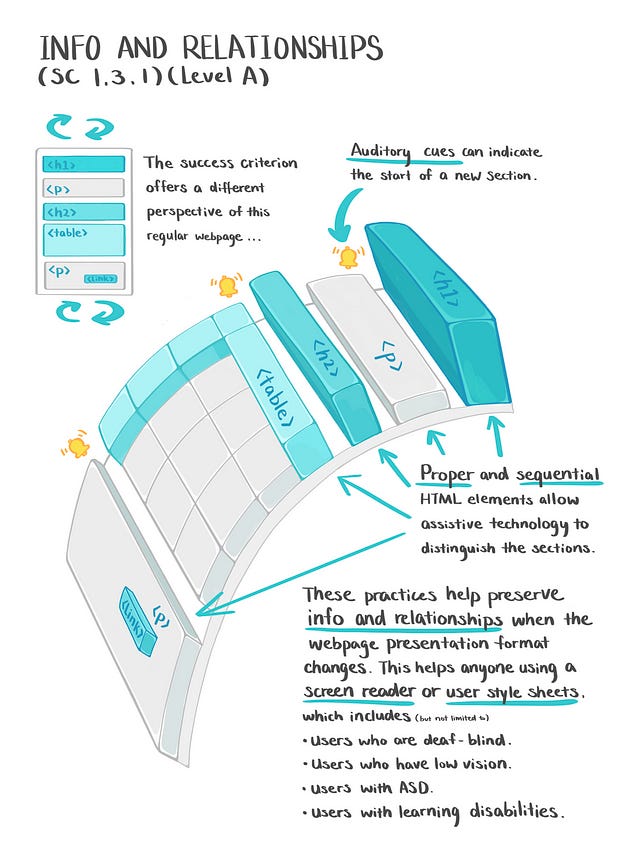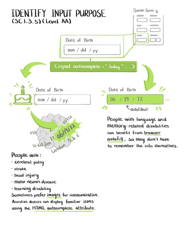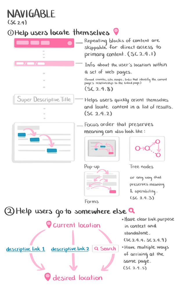 Scrolling through Maggie’s work, I was reminded that rephrasing, simplifying, and breaking down existing but complex knowledge can also be worthwhile work. So, instead of making myself formulate new thoughts about web accessibility when there are so many more qualified people researching and writing about it, I decided to illustrate some cognitive accessibility success criteria from WCAG. This process allowed me to dig into three specific success criteria and simplify what I learned into intuitive illustrations.